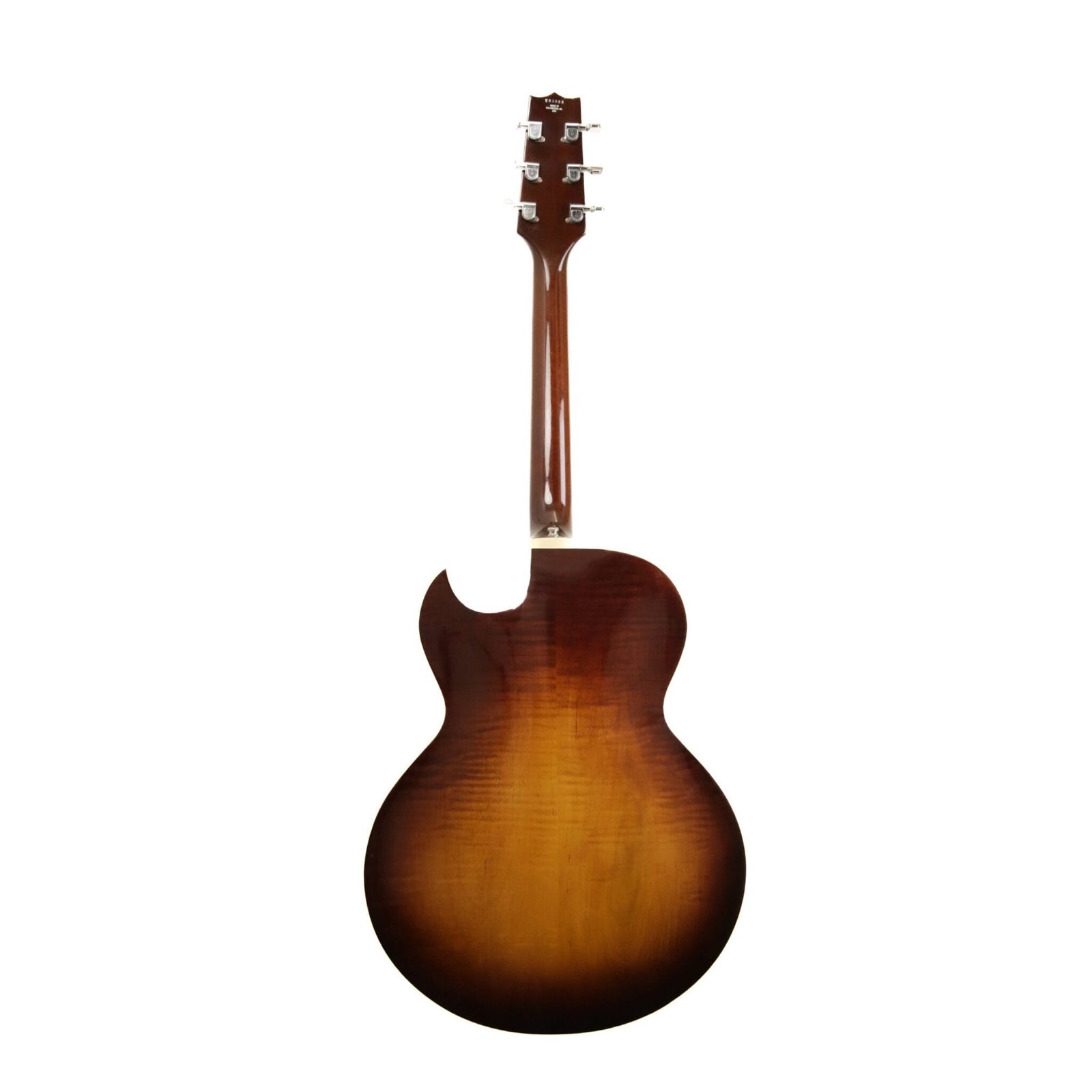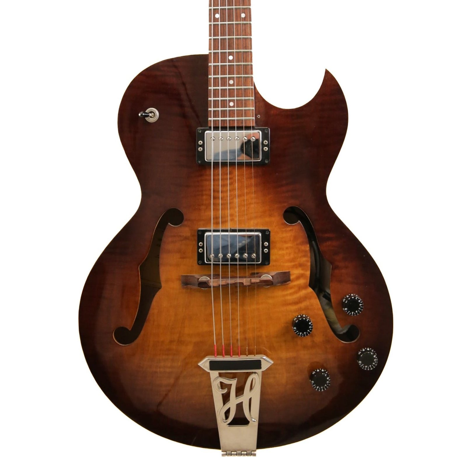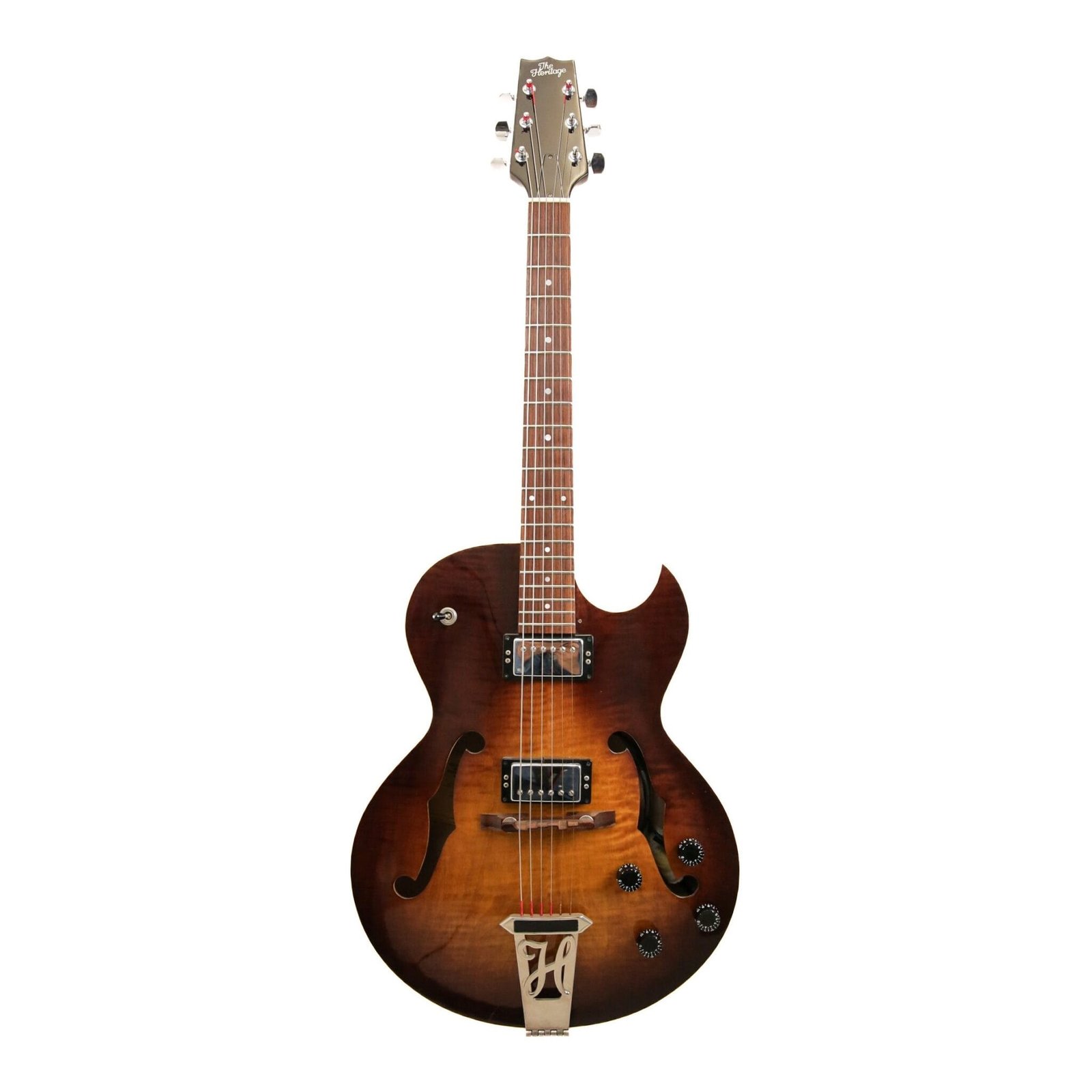 The 2005 Heritage H-575 in Tobacco Sunburst is a fully hollow-body archtop electric guitar. Crafted in the former Gibson factory in Kalamazoo, Michigan, the 575 is the Heritage cousin of the Gibson 175. It features a carved solid curly maple top, solid curly maple back, and solid curly maple rims. The guitar has a one-piece mahogany neck with a rosewood fingerboard. It is equipped with two original Heritage humbuckers, a rosewood bridge, and a trapeze tailpiece. The H-575 is lauded for its superb acoustic projection and warm, articulate tone, making it a favourite among jazz guitarists. This guitar has an amazing resonance and natural sustain to it without even plugging it in.