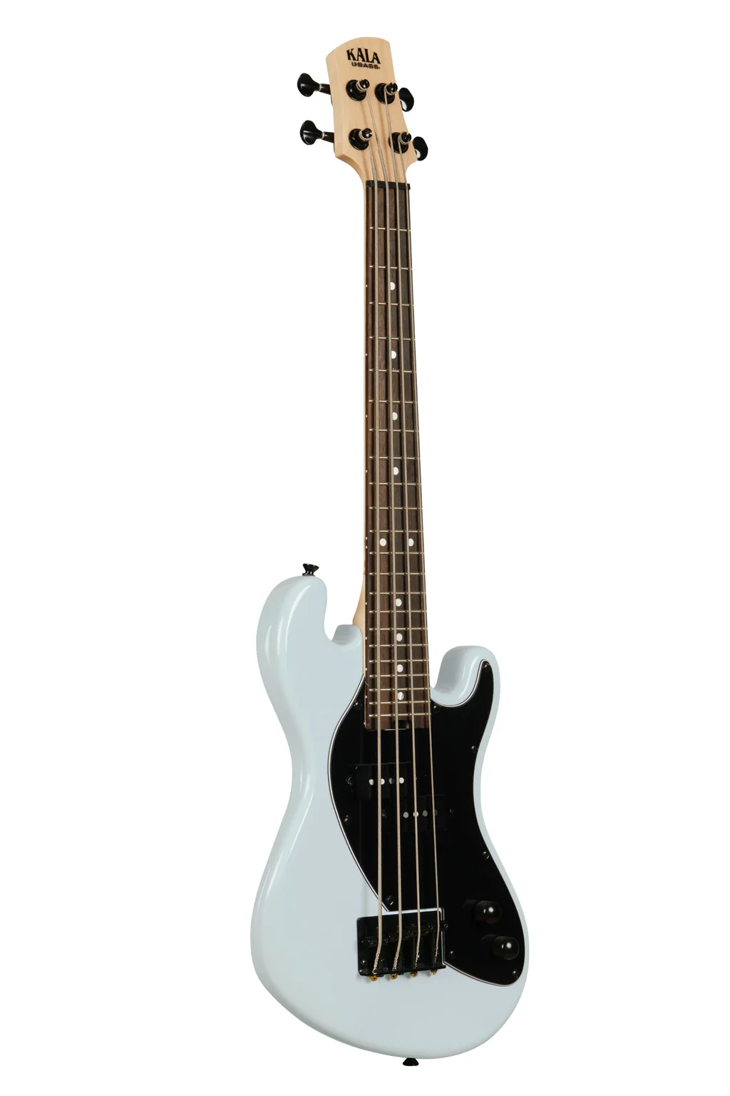 With its pastel Powder Blue finish, this solid body U•BASS brings a fresh retro vibe to Kala’s short‑scale bass lineup. The okoume hardwood body, maple neck, and laurel fingerboard (23.5″ scale) offer a familiar feel, and a passive split‑coil pickup delivers a thick, balanced tone. Black hardware and pickguard provide sharp contrast. Great for new or seasoned players who want a comfortable, stylish instrument and pros needing full‑size tone in a smaller package.