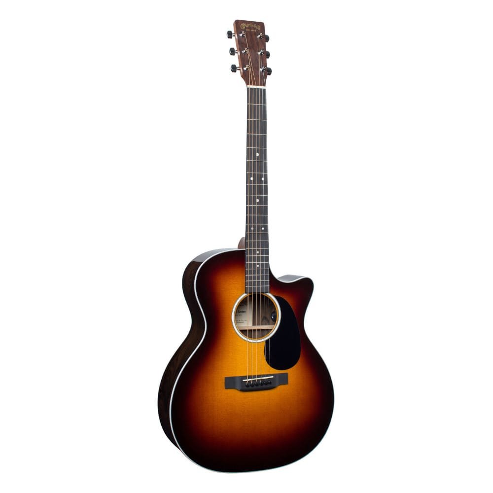 With a gorgeous glossed spruce top and ziricote back and sides, this solid wood Grand Performance cutaway model is a great sounding guitar at an affordable price. New to this model are stunning mother-of-pearl pattern fingerboard and rosette inlays, a multi-stripe rosette border, and white binding. It has an FSC® Certified Richlite® fingerboard and bridge, gloss body, and a hand-rubbed neck finish. Also new to this model is a Martin E-1 electronics package with a built-in soundhole tuner so you can tune up any time without using a pedal. This guitar comes with a burst option and Premium Soft Shell Case so it is Road-ready to join you on all of your adventures!
