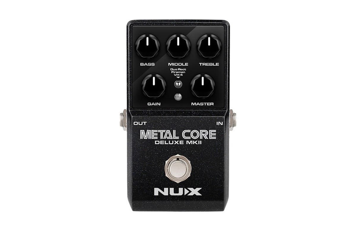 The NUX Metal Core Deluxe MKII is a high gain preamp pedal with 3 distinctive high gain amp models: the Duo Rect, Fireman, and VH 4. You can select these models via the 3-way toggle switch.