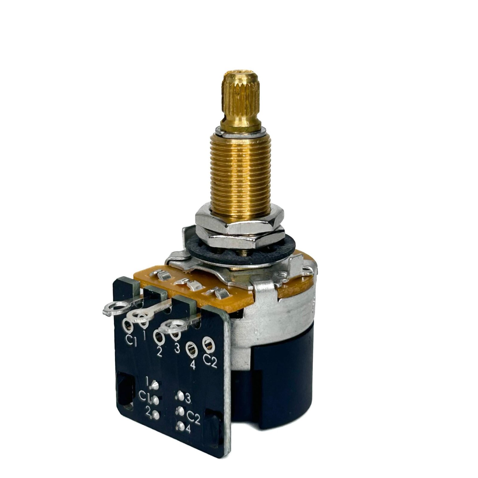 High quality CTS Push/Pull DPDT switches can be used to add phase switching, coil tapping, series/parallel, etc. to your guitar without having to drill the holes for a mini switch. The shorter body height and side mounted contacts require far less space (1” depth ) making them ideal for thinner bodied guitars with a more shallow body cavity. These Split-shaft pots are compatible with 24-spline, fine knurled knobs and feature a precise audio taper. Hex nuts, flat washer, and lock washer are included