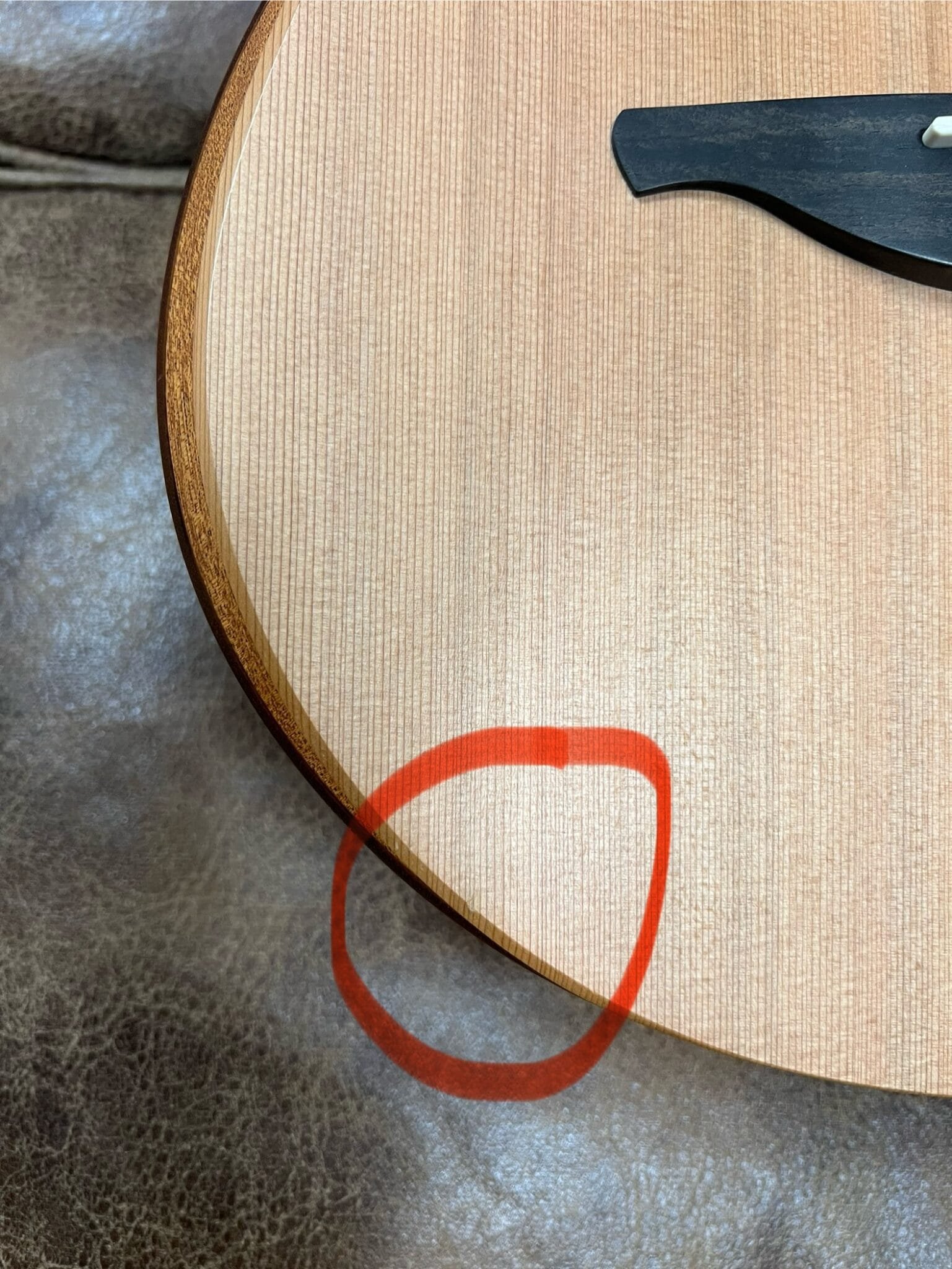 There is a small ding located between the top and the arm bevel below the bridge (see pictures).
