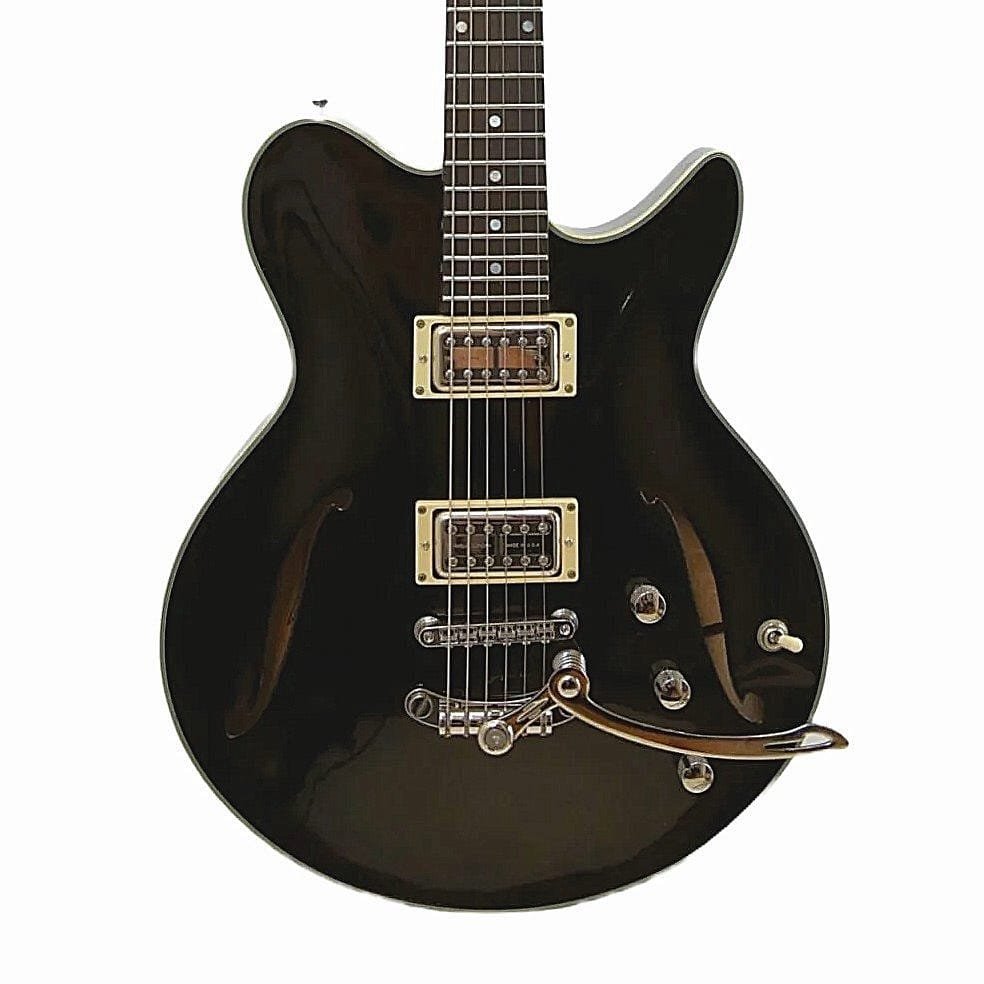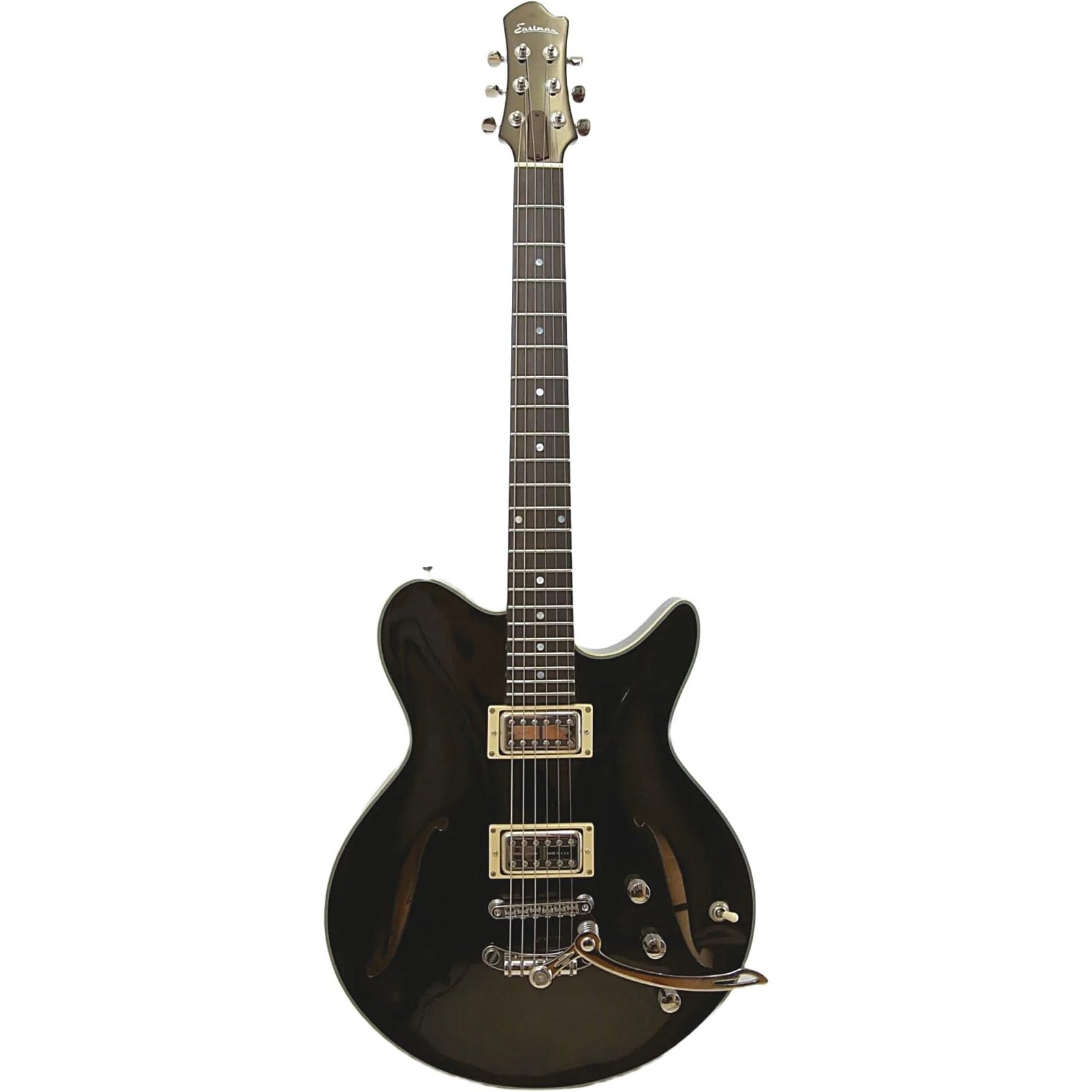 The 2023 Eastman Romeo-NYC is a modern thinline semi-hollowbody that combines a lightweight, resonant construction featuring a laminated Sitka Spruce top and Mahogany back/sides with a partial center block. The comfortable Maple neck with an Ebony fretboard and "Even C" profile is a joy to play across the Gibson-style scale. Stocked with a slate of hot-rod components, its unique voice comes from dual Seymour Duncan Psyclone Filter'Tron pickups, delivering classic, twangy chime and exceptional clarity. Hardware includes a highly functional Göldo TLT2N Les Trem system paired with a Göldo 3-point Vario-Bridge and Göldo locking tuners for expressive pitch bending and rock-solid stability, all housed in a comfortable, compact 14.75" body.