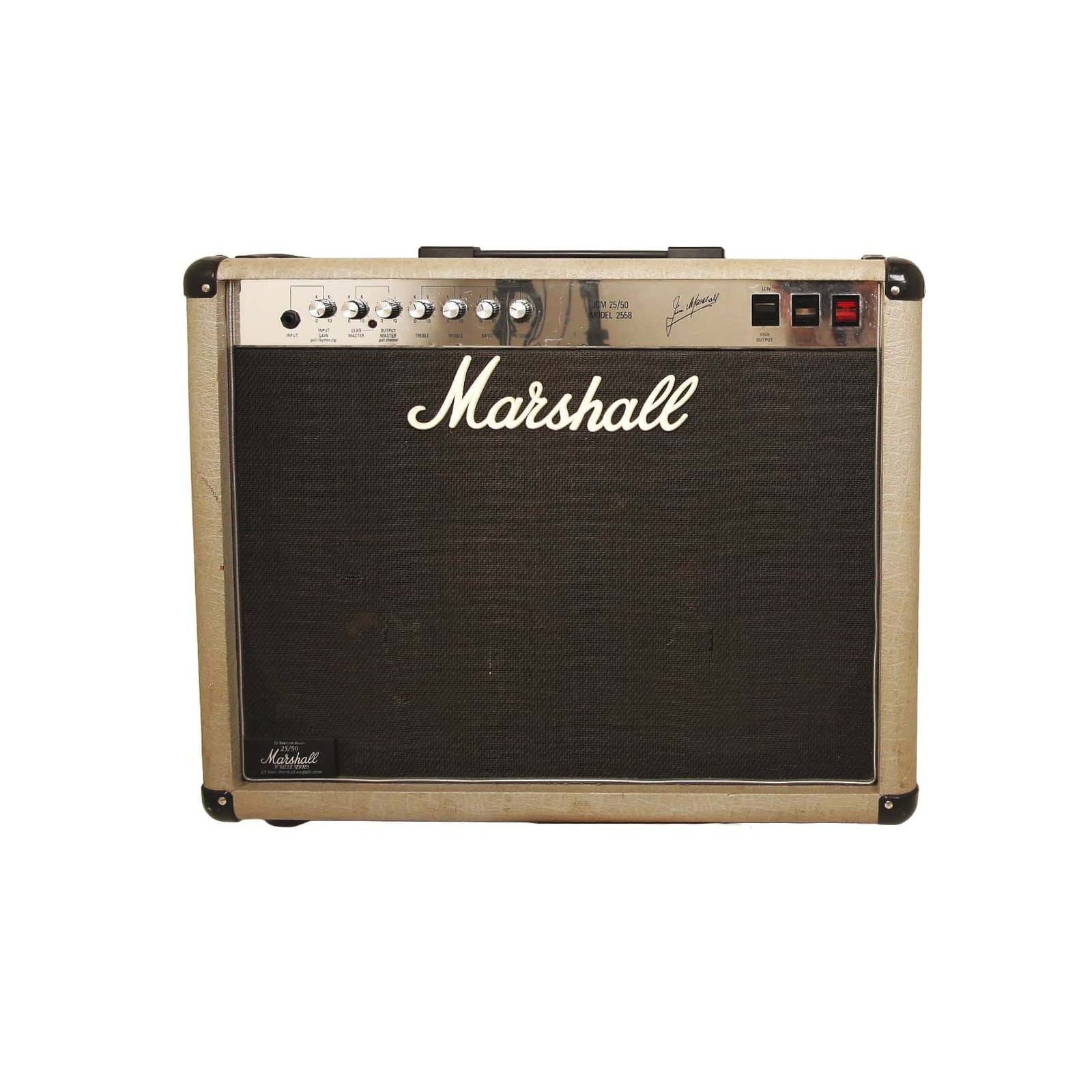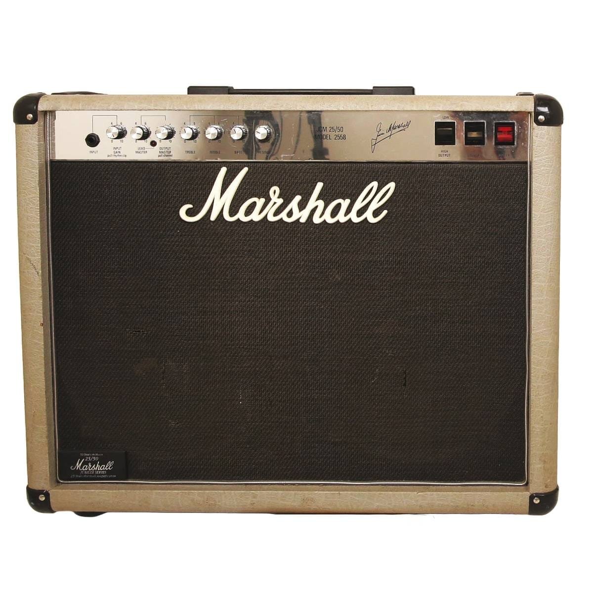 This 1987 Marshall 2558 Silver Jubilee is an original first-year production, 50-watt all-tube 2x12 combo finished in its iconic anniversary silver tolex. Highly sought after for its unique preamp circuit, this model features two EL34 power tubes driving a pair of Celestion G12T-75 speakers, with a high/low output switch that allows for toggling between 50-watt and 25-watt operation. The three-mode preamp system—offering Clean, Rhythm Clip, and Lead settings—provides a versatile gain range that has defined the signature sound of players like Slash and Joe Bonamassa. This unit is in good working order, delivering the thick, compressed high-gain tones characteristic of the series, and remains a collectible piece of Marshall history.