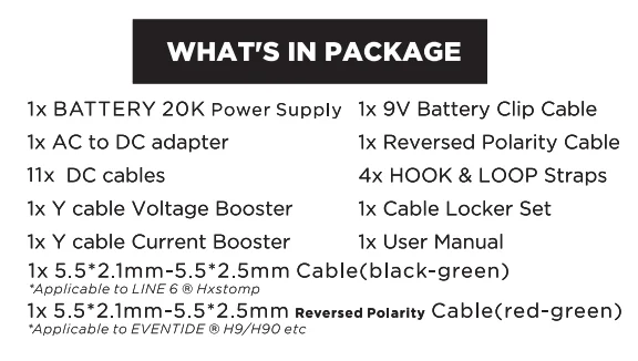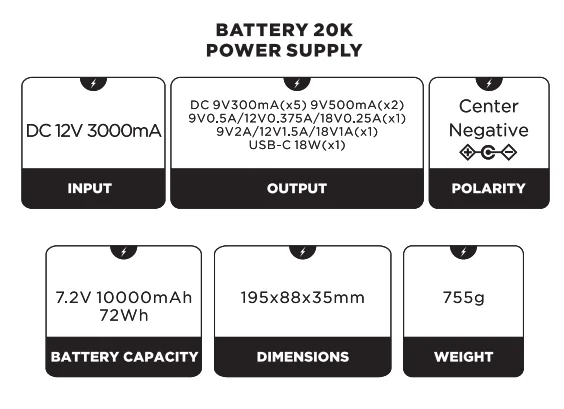 7: Output 9 not isolated, switchable between 9V 2A, 12V 1.5A, and 18V 1A. Indicator LED lights up when voltage is present.