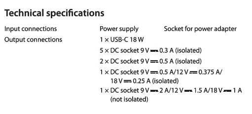 5: Outputs 1-7 isolated, 5 x 9V 300mA, 2 x 9V 500mA. Indicator LED lights up for each output when voltage is present.
